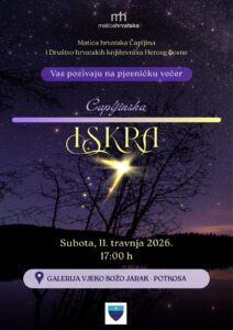 U prelijepom sunčanom ambijentu Galerije Božo Vjeko Jarak u Potkosi, na pola puta između Čapljine i Stoca, 11. travnja 2026., upriličena je prva hercegovačka poetska manifestacija Čapljinska iskra u organizaciji čapljinskoga ogranka Matice hrvatske, Društva hrvatskih književnika Herceg Bosne i Založbe kralja Tomislava. U ugodnoj atmosferi mediteranske i kamenite Hercegovine pjesnici su poetskim recitalima dali […]